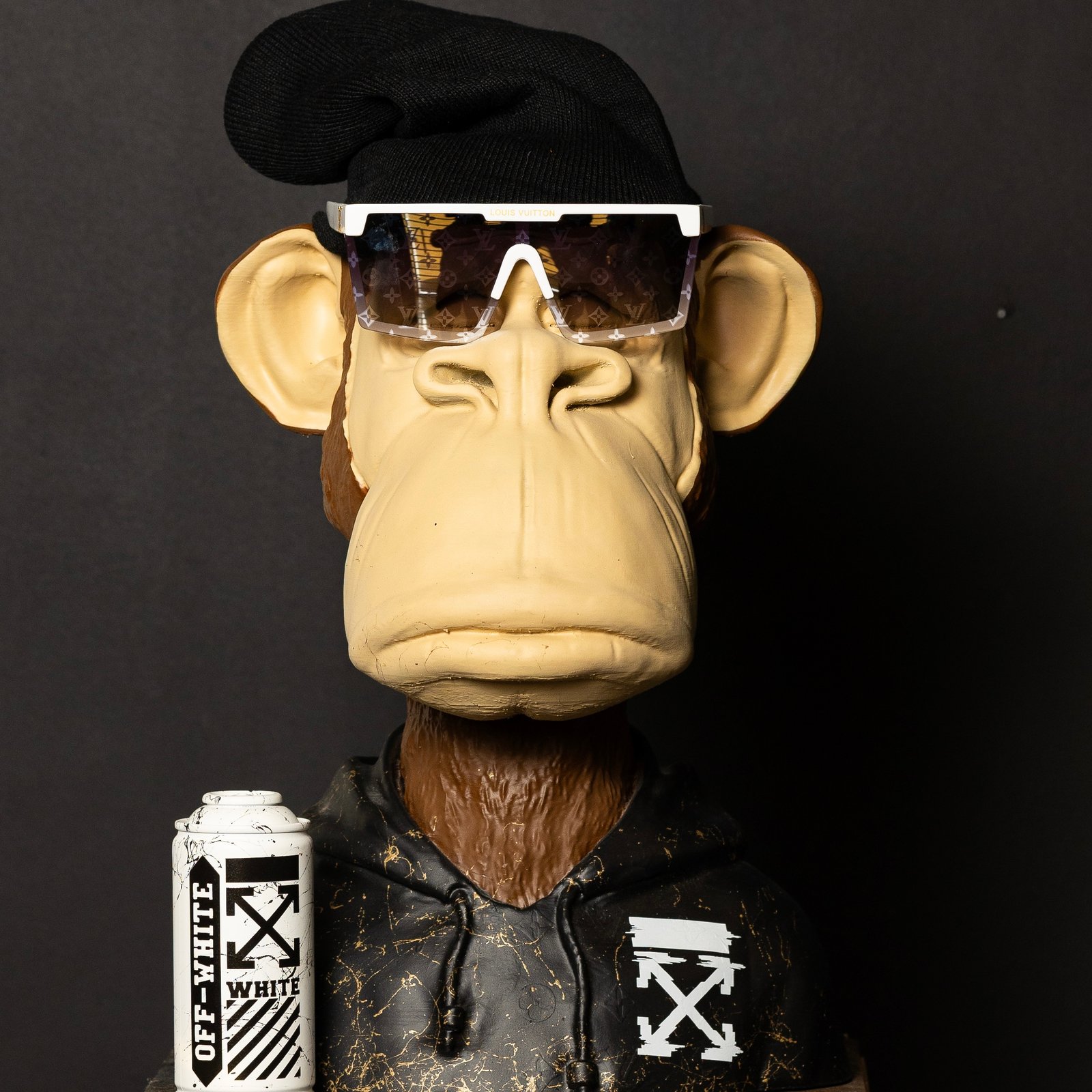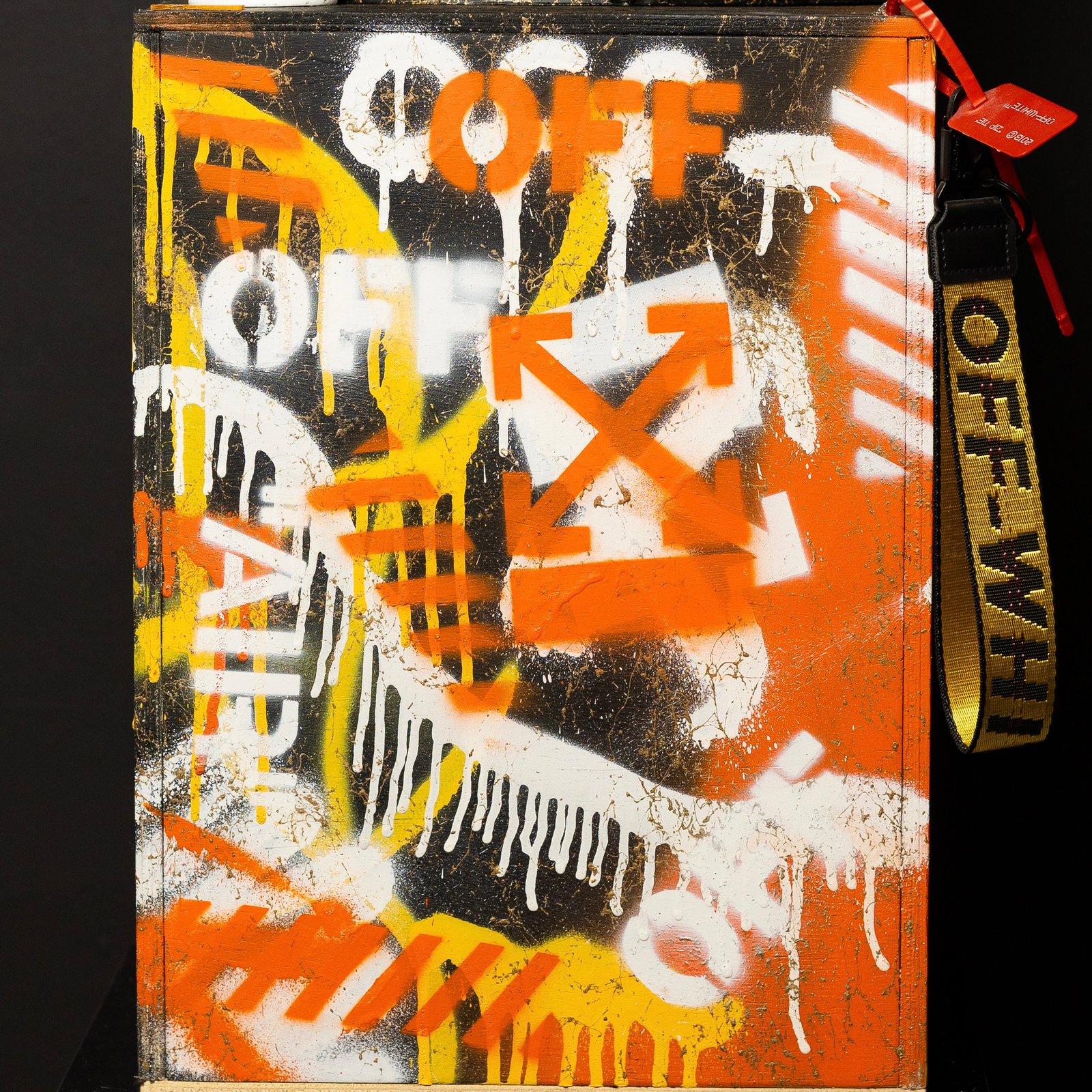 Acabamento: Hoodie preto com pintura automotiva e respingos dourados; estampa Off-White estilizada; spray personalizado exclusivo Off-White; base grafitada com camadas de stencil, tinta spray e lettering; óculos de luxo LV; gorro preto;
