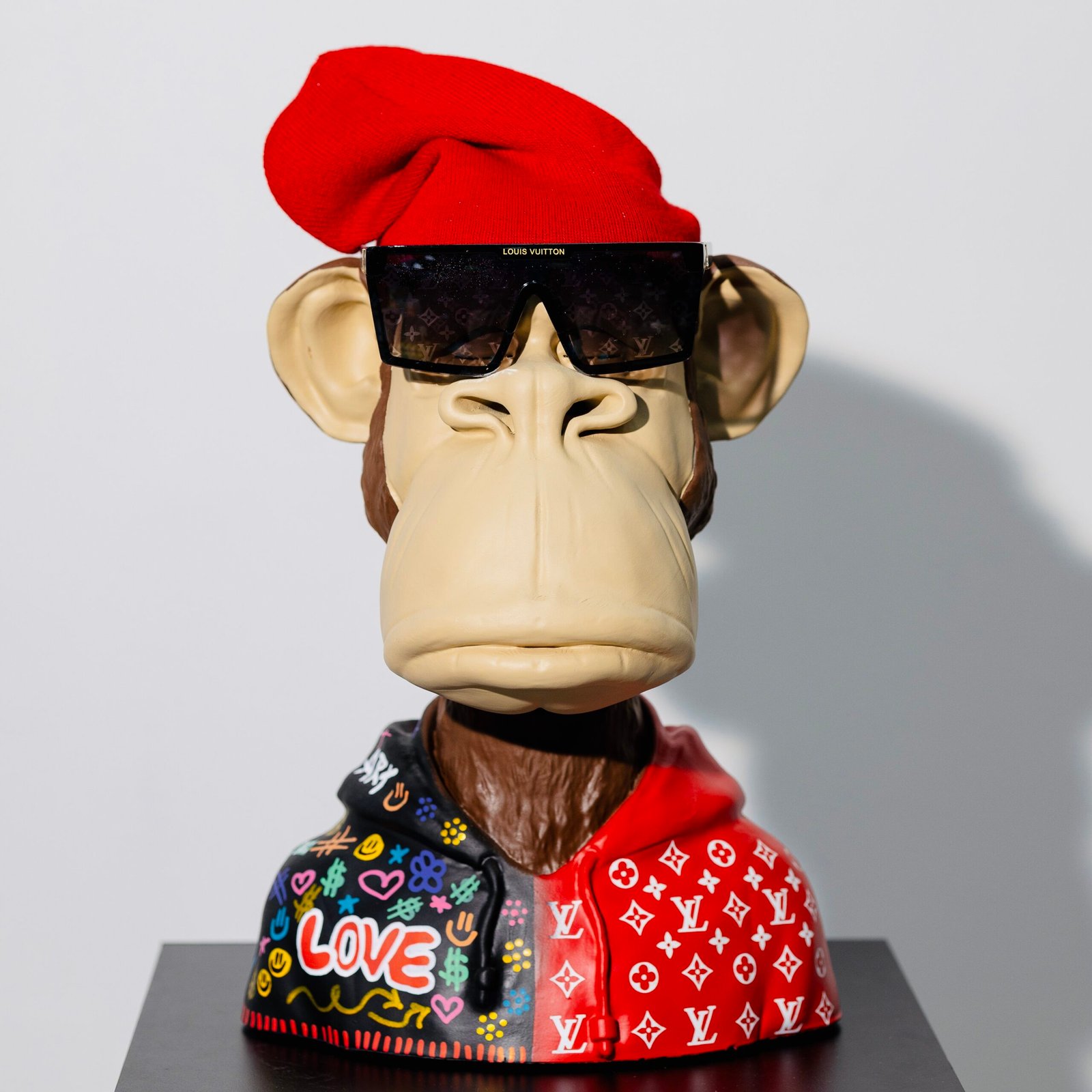 Acabamento: Hoodie dividido entre grafite urbano e padrão LV; pintura automotiva premium; aplicações artísticas feitas à mão; gorro vermelho; óculos Louis Vuitton;