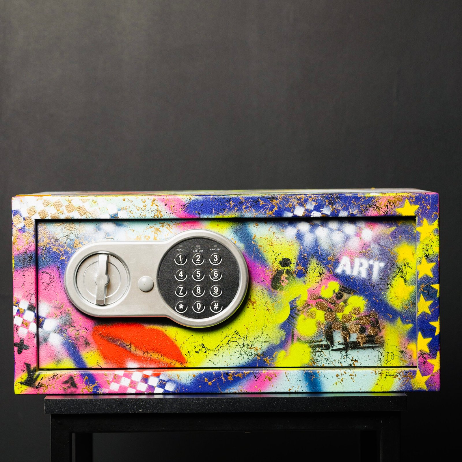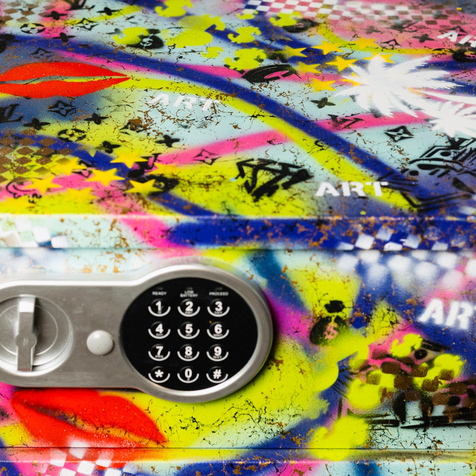 Com camadas de grafite, cores vibrantes e elementos de street art, a peça une segurança e expressão visual em um design único.