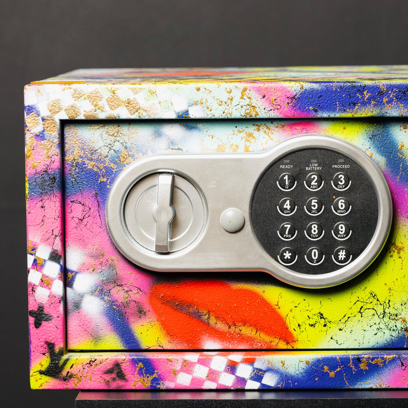Acabamento: Camadas de tinta spray em diversas cores; elementos de grafite e estêncil; painel frontal com cadeado digital funcional
