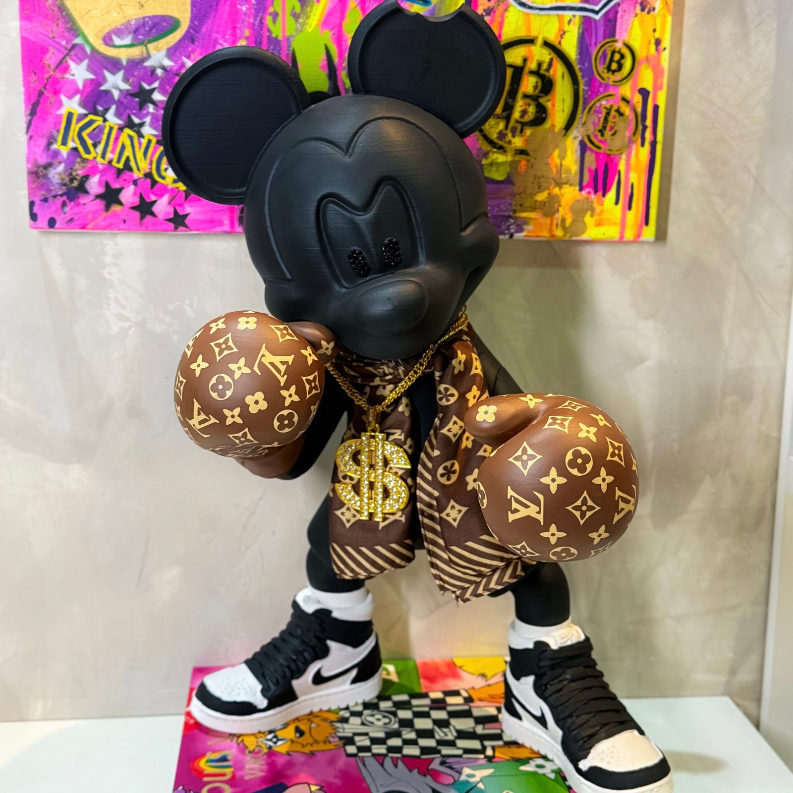 A escultura apresenta o personagem em preto piano, com luvas metálicas estampadas em estilo LV e detalhes brilhantes que reforçam sua força e estilo.